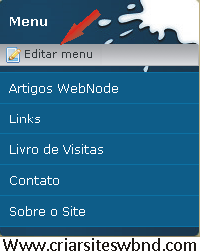 Para fazer isso você deve clicar sobre o link "Editar menu" que aparece acima do menu de nevageção. Confira a imagem abaixo.
