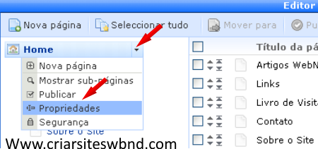 Você deverá expandir as propriedas clicando sobre a pequena setinha que aparece no lado esquerdo da janela, junto a página que você deseja editar e em seguida em "Porpriedades". Confira a imagem