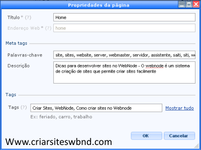 O próximo passo é definir o nome desejado no campo "Título". Você também poderá aproveitar para editar as palavras-chave, descrição e as tags da página que ajudam amelhorar o posicionamento das páginas nos mecanismos de busca. Confira a imagem abaixo.